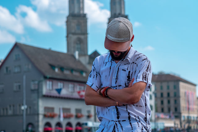 WICHTIGER HINWEIS: Die Muster der einzelnen Teile der Cap können von den auf dem Foto gezeigten abweichen, da die Schnitte in jedem der Stoffe zufällig erfolgen.